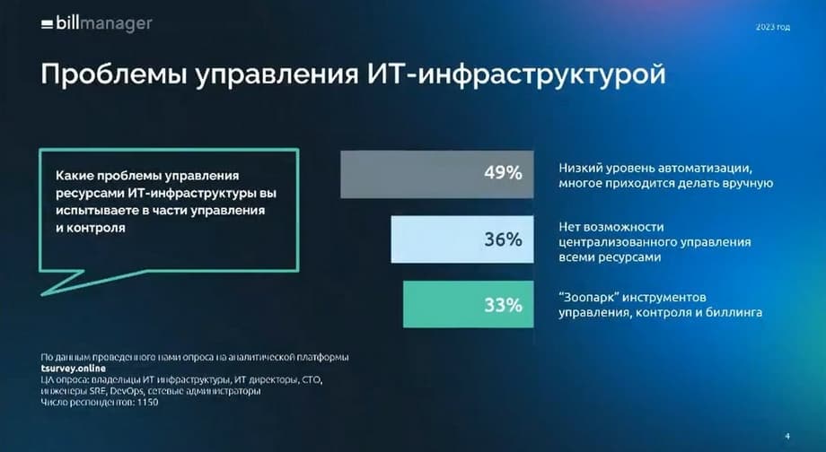 В прошлом году компания ISPsystem провела исследование, в ходе которого было опрошено более тысячи респондентов, в котором был задан простой и одновременно сложный вопрос: с какими проблемами управления ресурсами ИТ-инфраструктуры вы сталкиваетесь в части управления и контроля.