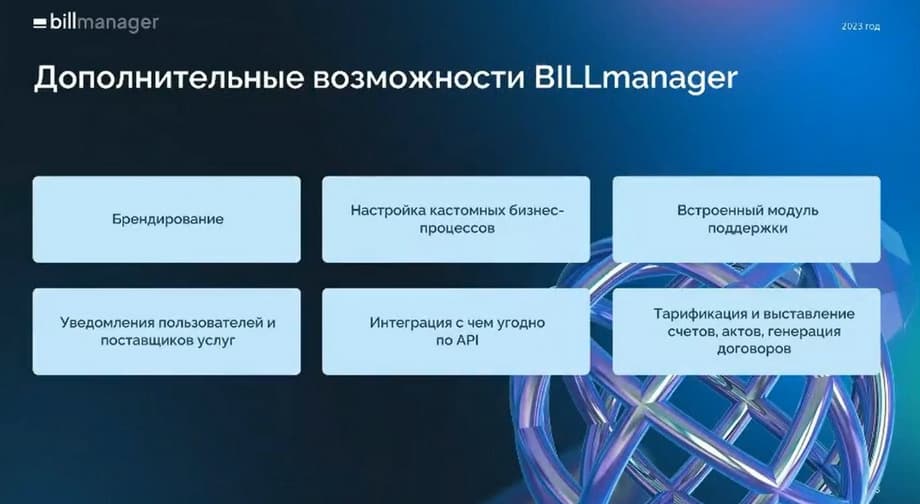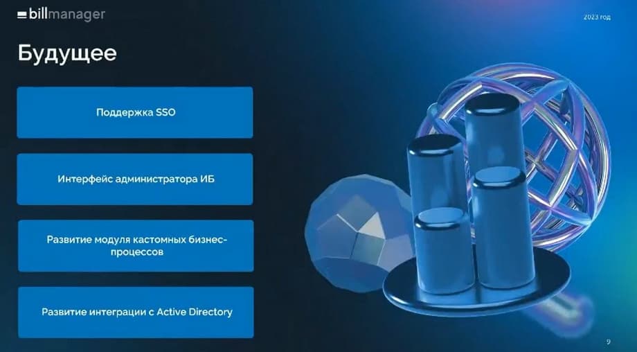 В скором времени у нас появится поддержка SSO. На текущий момент мы ведем исследовательскую деятельность по вариантам реализации. В дальнейшем планируем добавить новый функционал. Также мы постоянно общаемся с нашими действующими и потенциальными клиентами, ими востребован интерфейс администратора ИБ. Поясню, почему это так. В Billmanager все логируется, все сохраняется, т.к. это биллинговая система, и это ее задача все считать и все сохранять. Однако доступ к информации в большинстве своем возможен с использованием инструментов операционной системы, которая развернута под Billmanager, а не самого интерфейса. Мы планируем это исправить и предоставить специалистам ИБ отдельный раздел в меню со всей требуемой информацией. Помимо этого неизбежно развитие модуля Castom Business Process. На текущий момент функциональность этого модуля с нашей точки зрения, как и с точки зрения наших клиентов несколько ограничена и не покрывает всех запросов к ней. Мы будем эту функциональность развивать и улучшать.