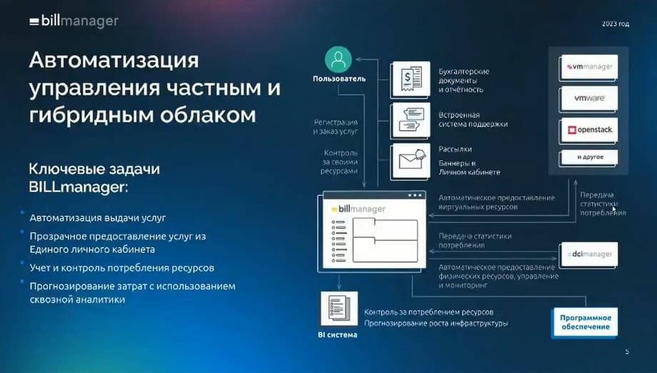 Billmanager предоставляет единый интерфейс для учета и управления всей виртуальной инфраструктурой из одного окна вне зависимости от используемых систем виртуализации. Естественно, те системы виртуализации, которые входят в пакет имеющихся интеграций. Можно управлять мультиоблаком, которое построено на различных системах виртуализации. Это будет актуально для компаний, которые росли через поглощение. А такие ситуации сейчас не редки для российского рынка. Поэтому этот продукт помогает из единого окна и единого интерфейса управлять различными ресурсами, построенными в различных системах виртуализации.