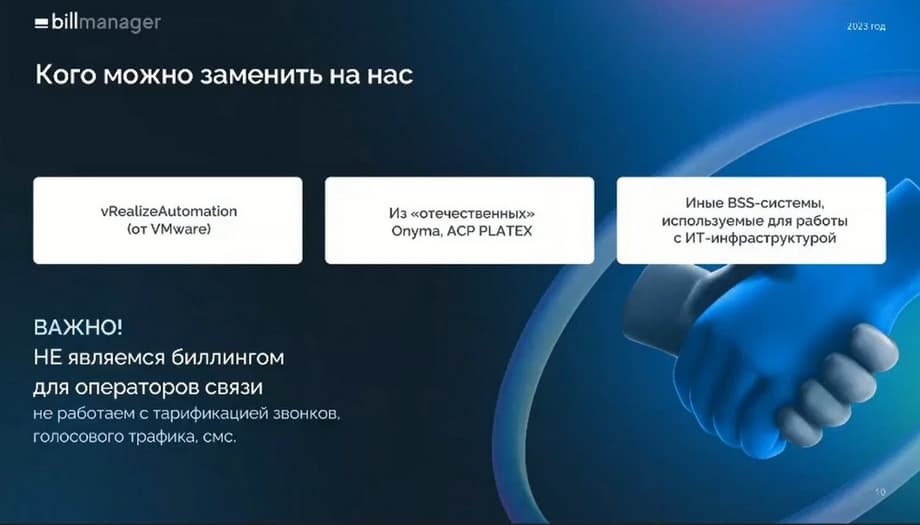 Из отечественных решений с точки зрения управления инфраструктурой это Cloud Link и Rustec ESU. Если говорить биллинговых системах, то это Onima и ACP PLATEX. По сути любые биллинги, кроме телекоммуникационных. Т.е. мы не являемся биллингом для телекоммуникационных услуг. С остальными биллинговыми системами успешно конкурируем и в большинстве случаев возможности наших платформ существенно шире, чем у конкурентов. Мы можем заменять любые системы, которые требуются для работы с ИТ-инфраструктурой. В том числе различные самописные решения, которые до сих пор популярны у некоторых компаний. В целом область применения Billmanager достаточно широка.