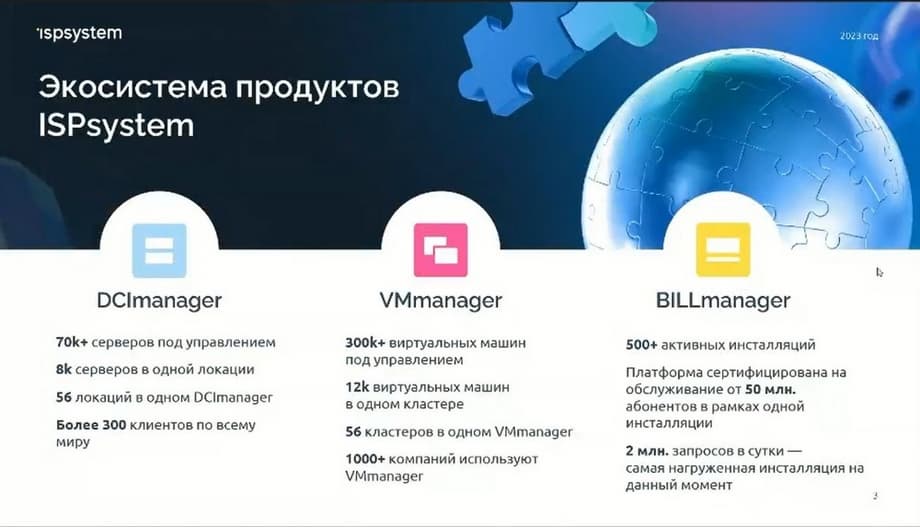 DCImanager – это платформа управления физическими серверами и ИТ-оборудованием, VMmanager – это платформа виртуализации и BILLmanager – это платформа для внутреннего биллинга, для автоматизации представления физических ресурсов, для управления мультиоблачными геораспределенными ИТ-инфраструктурами из единого окна, очень обширная по функциональности платформа.