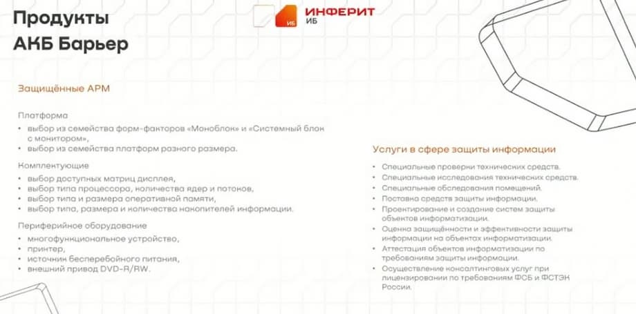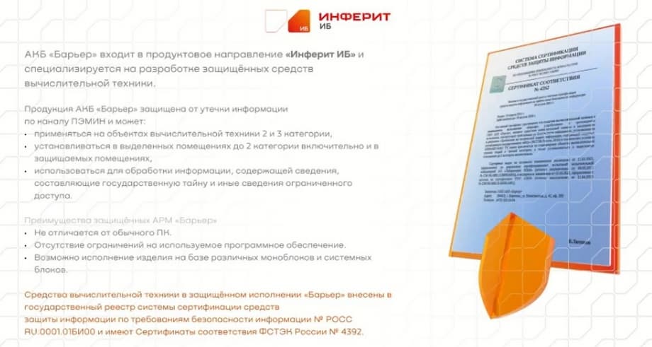 Несколько слов о новом направлении, которое у нас недавно появилось, это «Инферит ИБ». В этом направлении есть решение, которое называется "Барьер". Это решение, сертифицированное ФСТЭК под работу с гостайной.