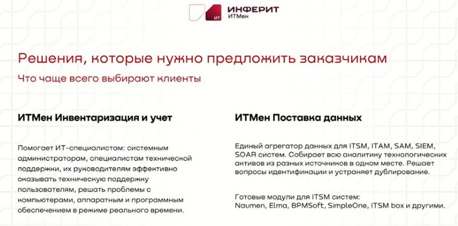 На сегодня мы можем предложить два коробочных решения: «Инферит ИТМен инвентаризация и учет» и «Инферит ИТМен поставка данных», по сути это один продукт, но у него два разных заказчика.