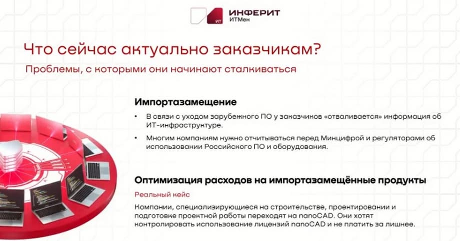 Сегодня речь пойдет о продуктовом портфеле «Инферит»: «Инферит ОС» – разработка, проектирование и внедрение российских Linux операционных систем; «Инферит Клаудмастер» – ПО для управления мультиоблачной и приватной ИТ-инфраструктурой; «Инферит ИТМен» – ПО для управления ИТ-инфраструктурой и контроля ИБ; АКБ «Барьер» – сертифицированная защищенная техника для работы с гостайной; партнёрская программа «Инферит».
