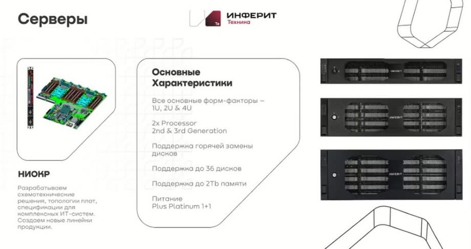 Что касается серверов. Стандартные платформы производятся на базе «Ивнино». У нас с ними давно сложившиеся отношения. НИОКР помогает разрабатывать схемотехнические решения, топологию плат, спецификации для комплексных ИТ-систем. Используются самые ходовые форм-факторы. В основном это массовые форм-факторы 2U, а также 1U, 4U, 3U. Поддерживается горячая замена жестких дисков. Чаще у нас двухпроцессорные системы с самыми основными потребностями по дискам, по памяти, по питанию, по весу.