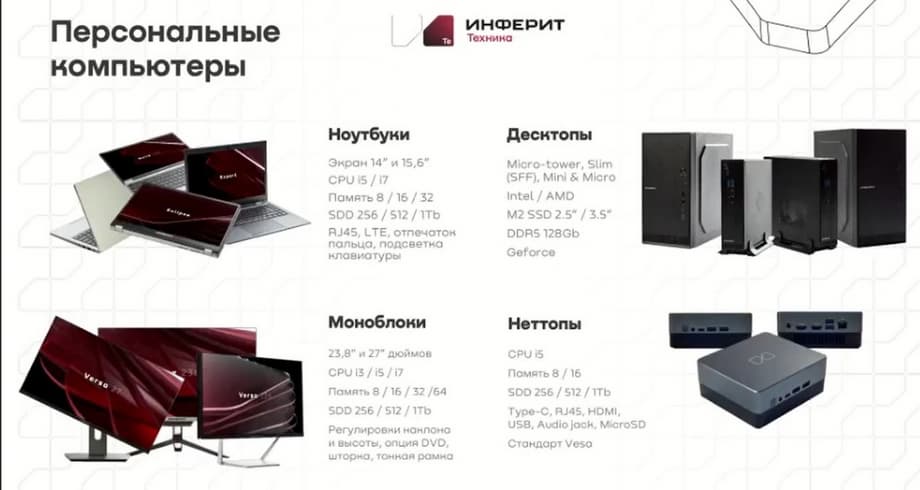 Теперь о персональных компьютерах. Производим ноутбуки с экранами 14 и 15,6 дюймов, с памятью в 8, 16 и 32 Гбайт, с дисками 256, 512 Гбайт и 1 Тбайт. У нас практически нет розничных моделей, т.е. некоторые десктопы, самые недорогие, приближаются к розничному сегменту. Нами выпускаются десктопы Micro-tower, Slim, Mini и Micro, на процессорах таких вендоров как Intel и AMD. Все основные форм-факторы есть, точно также все конфигурируется с трафиком и без оного. Можем даже собирать игровые машины, такое тоже иногда заказывают.