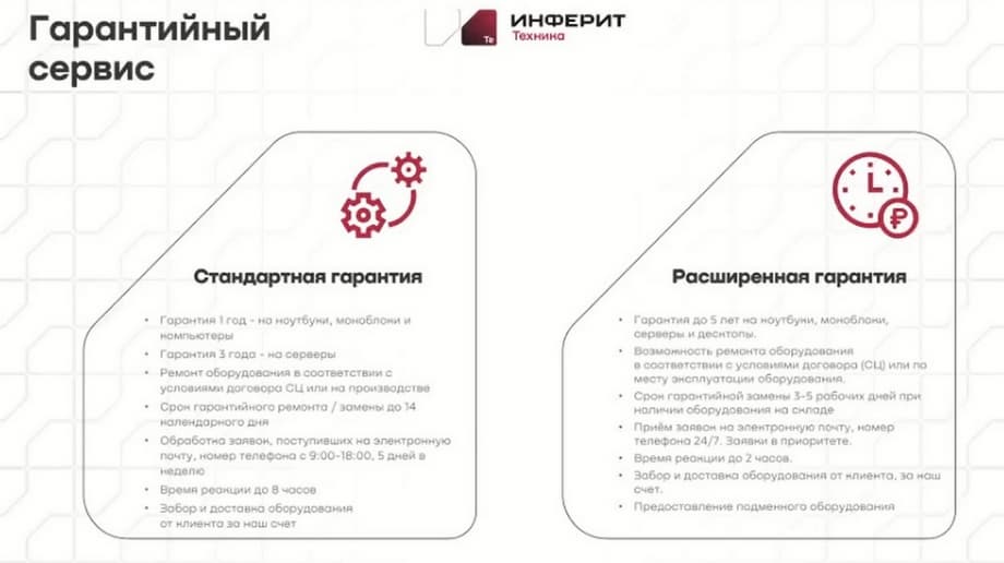 Стандартная гарантия составляет один год на ноутбуки, моноблоки, компьютеры и 3 года на серверы. Ремонт оборудования осуществляется в соответствии с условиями договора СЦ или на производстве. Срок гарантийного ремонта (замены) составляет 14 календарных дней. Обработка заявок, поступивших через электронную почту с 8:00 до 18:00 пять дней в неделю. При этом время реакции составляет примерно до 8 часов. Забор и доставка оборудования осуществляется за счет компании «Инферит».