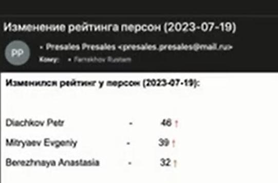 Он крайне минималистичен. Он содержит информацию о том, по каким сотрудникам произошел скачок уровня риска, скачок рейтинга. Мы видим, что их всего трое. Это те сотрудники, на которых офицер безопасности должен обратить внимание. И, получив такое уведомление, офицер безопасности переходит в консоль InfoWatch Prediction и там он может получить уже полную картину в масштабах компании о том, как распределены уровни риска, т.е. такие баллы оцифрованы по сотрудникам.