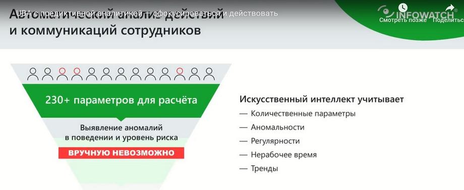 Ранее я говорил о том, что для многих людей система имеет значительный минус. Мы этот момент учли. И ключевая особенность нашей системы в том, что в основе лежат алгоритмы машинного обучения, и это позволяет обеспечить гибкость и адаптируемость системы к изменяющимся процессам внутри компании. Система находится в процессе постоянного обучения. Пороги устанавливаются индивидуальные для сотрудников, и они динамичны. Со временем пороги могут изменяться в ту или иную сторону, когда система понимает, что норма изменилась. Пример с рабочим временем. Может происходить так, что по каким-то причинам временные интервалы смещаются в ту или иную сторону, т.е. смещаются пороги определения нормы. Но это не значит, что все так сложно и не прогнозируемо. В принципе, InfoWatch Prediction может использовать комбинацию нечетко заданных порогов с четко заданными порогами и выставлять в этом развесовку.