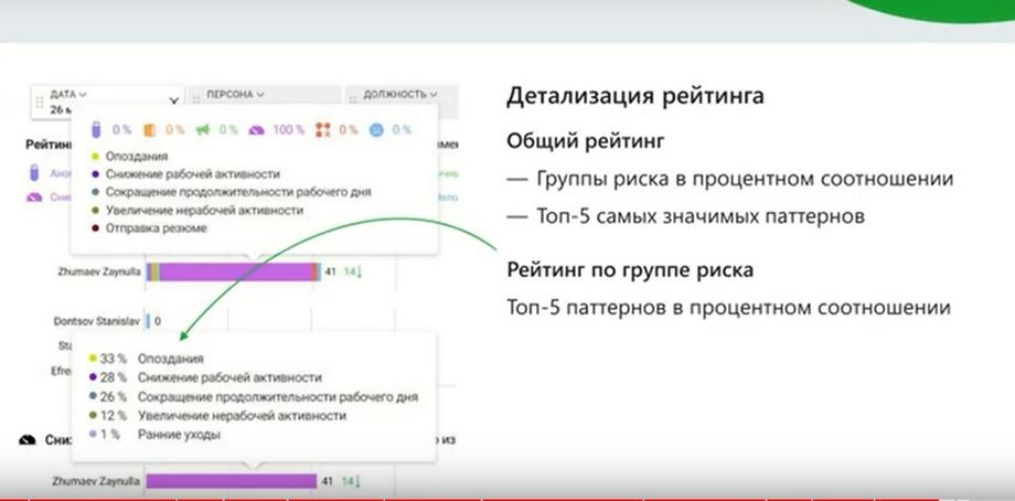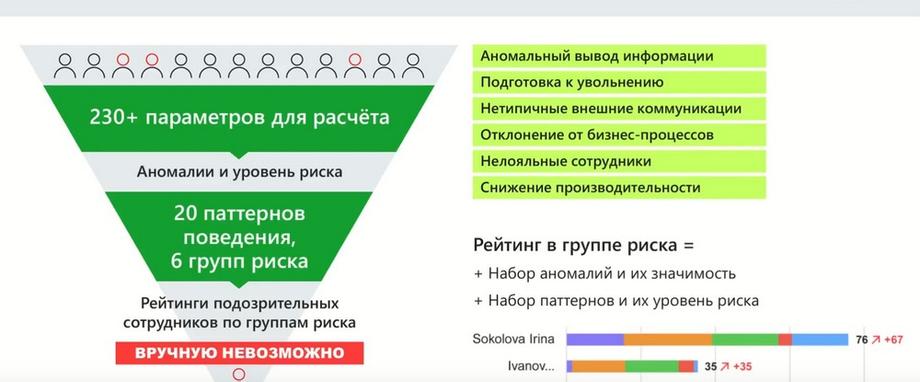 По тем более чем 230 параметрам создаются некие комбинации, которые образуют собой паттерны, и из них уже складываются группы риска. Мы видели эти группы, их сейчас 6 штук. А в планах расширять как число паттернов, так и число групп риска. И далее пользователи получают в простой форме визуализацию того, как по сотрудникам распределены паттерны и группы риска.