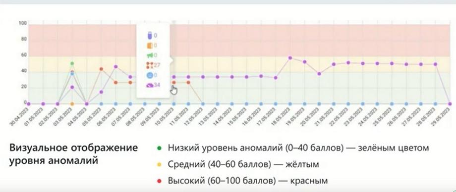 Сейчас для того, чтобы обучить систему, нужен некий массив данных, собранный за период времени. Сейчас у нас заложено 28 дней или 4 недели. Это цикл с неизменяемым количеством выходных дней. Этот период берется как некий достаточный для того, чтобы обучить модель на неких повторяющихся действиях сотрудников, и этого достаточно для того, чтобы установить и определить нормы поведения и далее выявлять отклонения от норм.