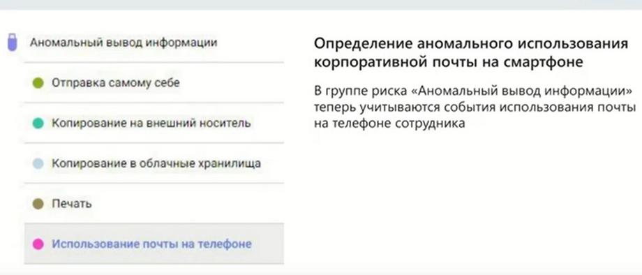 Чуть подробнее расскажу о том, что это такое. Есть такой канал потенциальных утечек, на который не так часто обращают внимание, это возможность синхронизации корпоративной почты с мобильного устройства. Часто в компаниях такой способ разрешен, он является легитимным. И сотрудник, в случае, когда он легитимно работая с почтой, просматривая ежедневно, скажем 10 писем, а в какой-то момент начинает скачивать почту за год со всеми вложениями. Это означает аномалию в том, как он обычно работает. InfoWatch Prediction такую аномалию выявляет и подсвечивает ее в группе риска аномальный вывод информации. Т.е. потенциально сотрудник может это делать для того, чтобы унести эту информацию за пределы предприятия. И это можно считать риском утечки.