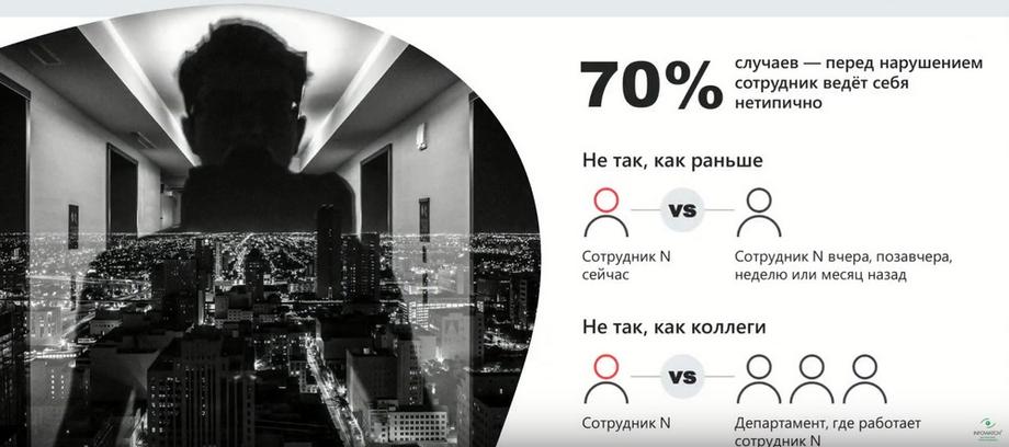 У нарушителя часто есть какая-то мотивация и ее тоже можно выявить исходя из анализа его поведения. В 70% случаев перед нарушением сотрудник ведет себя как-то иначе, есть определенные признаки в его поведении, есть определенные аномалии относительно своих же действий в прошлом, либо относительно группы, в которой сотрудник находится.