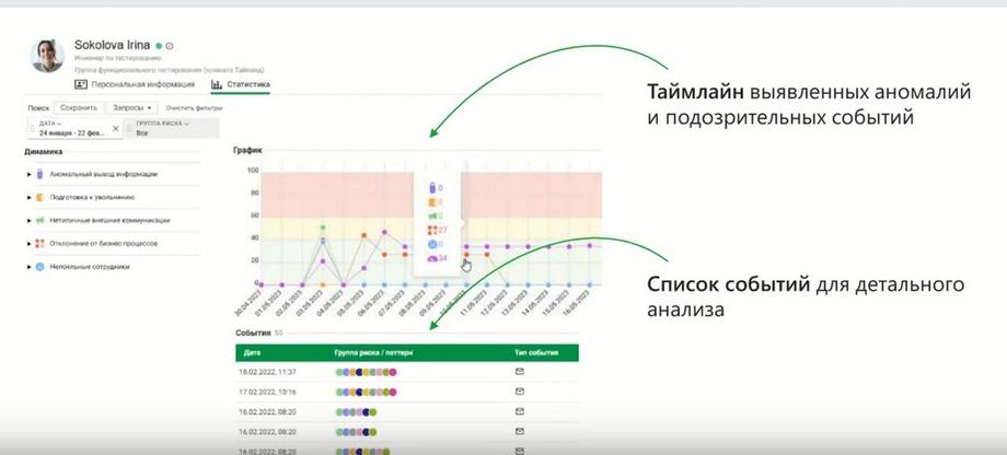 У нас в планах есть реализация такого дашборда событий. Смысл его заключается в том, что те паттерны, т.е. признаки групп риска, которые есть в нашем распоряжении, мы раскладываем на этапы. Мы следуем такому предположению, что нарушению предшествует некий ряд признаков, которые можно разложить в последовательности. Сотрудник, который готовится к тому, чтобы увести информацию, у него есть мотивация, либо, если сотрудник отличается халатностью, у него есть признаки неправильной работы с информацией, а дальше могут быть действия подготовки к нарушению и т.д. Т.е. имеется некоторая последовательность. И, отображая признаки в такой последовательности, подсвечивая красным высокий уровень риска, желтым - средний и зеленым - низкий, мы можем более качественно разобраться с тем, что происходит, по каким признакам мы можем судить о том, что есть действительный риск утечки или какого-то другого нарушения.