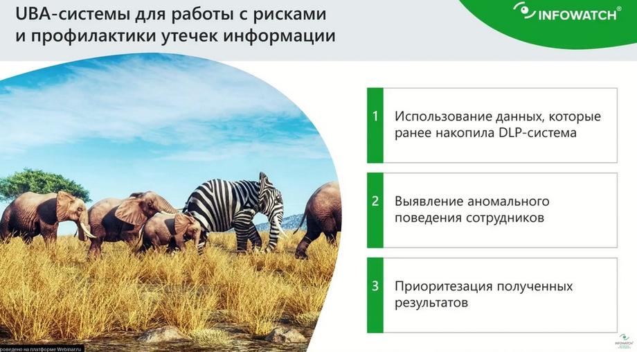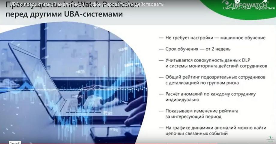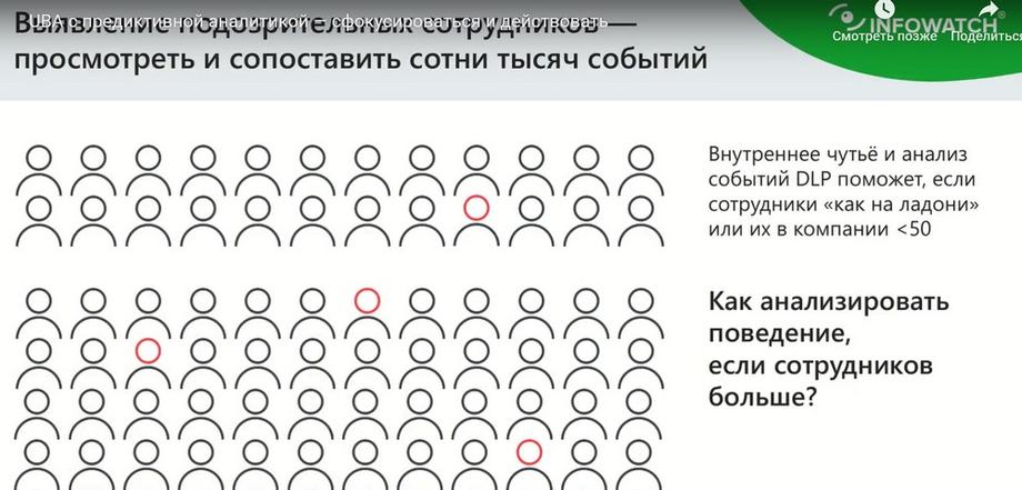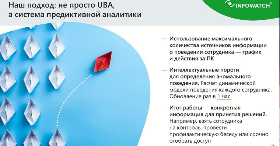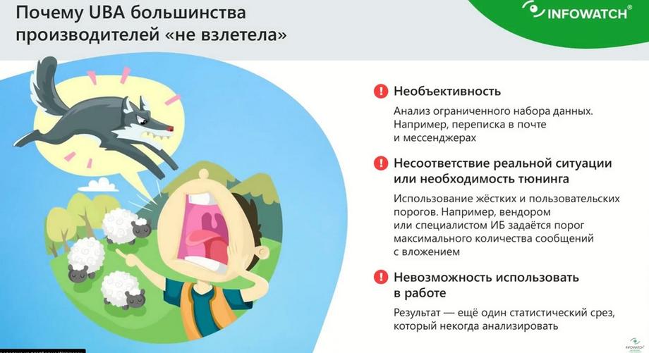 Например, если мы используем данные исключительно о коммуникациях, т.е. это содержимое переписки, то это может не давать полную картину того, что происходит с сотрудником, как он действует, как меняется его поведение. Во-вторых, зачастую UBA-система построена на жесткой логике. И, если мы говорим о том, что UBA позволяет, например, находить отклонение от норм, то нормы могут задаваться жесткими порогами. Самый очевидный пример. Попробуем находить сотрудников, которые работают в нерабочий день. Чтобы понять, что работник работает в нерабочий день, нужно задать пороговые значения: 9:00 - начало рабочего времени и 18:00 - конец рабочего дня. При отклонении активности пользователя от этого временного интервала, это признается отклонением от нормы. Учитывая, что компании достаточно динамичны, процессы меняются, действия сотрудников меняются, сами сотрудники меняются, в постоянном режиме поддерживать актуальность таких моделей - задача практически невыполнимая. И, как правило, в таком варианте система просто умирает, потому что не может адаптироваться к изменениям. И в-третьих, UBA-система не дает того уровня возможностей использовать результаты анализа так, чтобы решать первостепенную задачу. Первая задача - это вовремя с нужным уровнем точности определить некоего потенциального или явного активного нарушителя. UBA-система может предоставлять какие-то отчеты, разрезы данных, но для того, чтобы сделать какие-то выводы, требуются дополнительные усилия. И не всегда эта полученная информация для пользователя решает эту задачу.