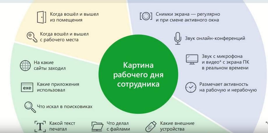 Если этих данных недостаточно, у нас в распоряжении есть система мониторинга активности сотрудника. Эта система дает более глубокое погружение в то, чем сотрудник занимался. Т.е. кроме статистических показателей о времени работы, о том, какие приложения открывались, какие ресурсы посещались, есть еще возможность заглянуть в то, что происходило на рабочей станции, потому что есть скриншоты, есть записи с микрофона, есть записи о файловых операциях.