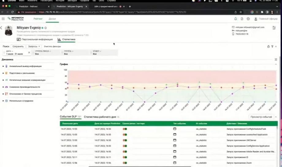 Отклонение от бизнес-процессов – это, как правило, использование нетипичных приложений. И тут мы можем посмотреть, что это за приложения, и в какое время они открывались. И исходя из этого, мы можем сделать выводы, сам InfoWatch Prediction даже без модуля мониторинга активности, дает уже довольно полную картину для того, чтобы делать выводы по конкретному сотруднику.