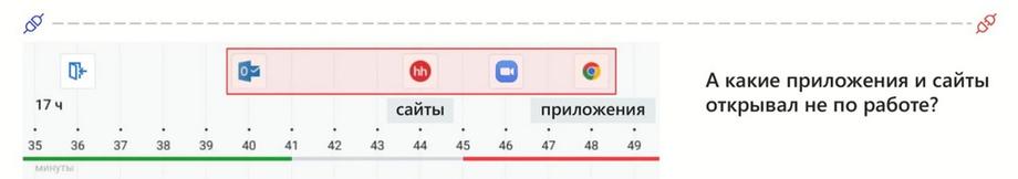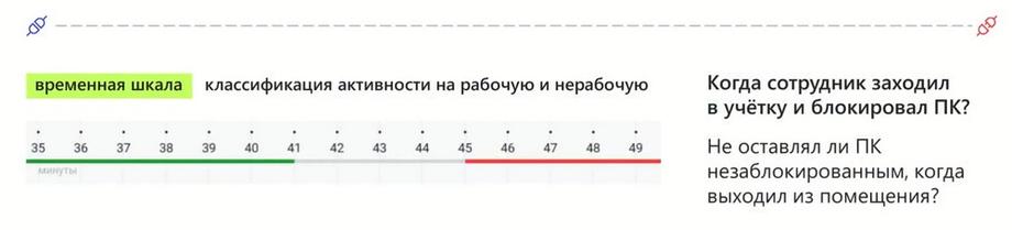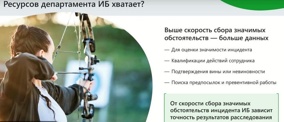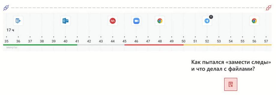 Очень часто требуется соотнести рабочую активность человека, его потенциальный умысел инцидента с его какими-то встречами. Например, человек во время видеосвязи может шарить экран, это тоже может быть связано с утечкой информации, через скриншоты, использование приложений. И та встреча из календаря Outlook, кому и как что-то человек демонстрировал. Мы здесь можем несколько вещей соединить в одну, и понять во всех ракурсах, как мы можем посмотреть на проблему или на точку инцидента. И, кроме того, собрать интерактивную доказательную базу. Потому что одно дело, когда, например, отчет руководство подает в виде череды событий, какой-то список и комментарии к нему, то здесь скриншот правильно сформированного отрезка даже руководству поможет быстро разобраться, в чем состояла суть инцидента, если он рассматривается предметно.