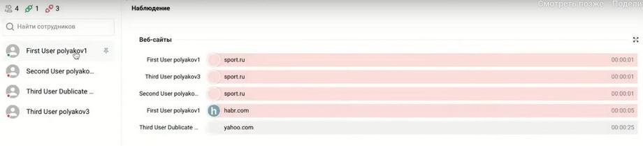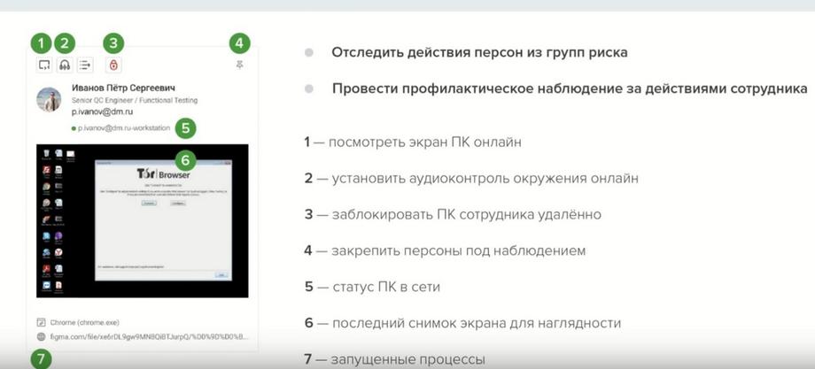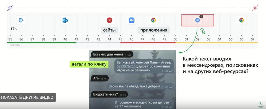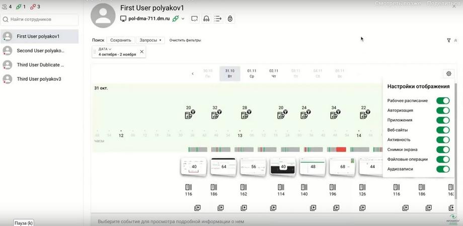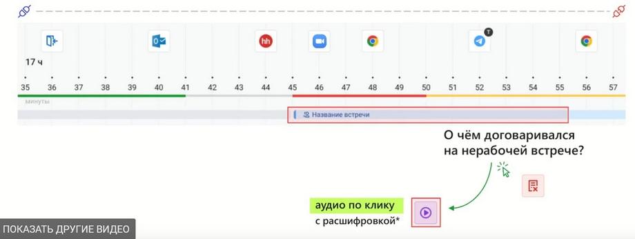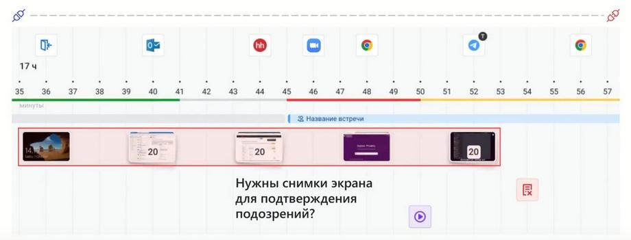 Здесь продолжение той же мысли, что понимание одновременности и представление одновременности аудиозаписи, например, если это была какая-то встреча, и была настроена аудиозапись по триггеру или в целом, если сотрудники, находящиеся под наблюдением, его слушали, то мы видим, что если ко встрече приложена аудиозапись, то ее сразу можно прослушать. У нас есть еще и скриншоты, чтобы понять, что человек во время аудиозаписи по каким сайтам он перемещался и что смотрел. А также, возможно, вводил некий текст, который нас может заинтересовать. Для исследований "под микроскопом" у нас имеется весь инструментарий.