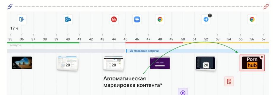 В итоге у нас получается, что все контенты расположились на таймлайне и отвечают задачам целевого детального расследования инцидента ИБ, Кроме того, мы недавно представили первую версию, прототип нашей новинки. Мы будем маркировать контент на скриншотах определенными лейблами. Мы взяли для примера нашу технологию, которая может анализировать скриншоты и маркировать наличие непристойного контента. Такого, как просмотр порнографической и эротической тематики. И мы выставляли такую метку, которая свидетельствовала о том, что такой-то человек просматривал web-сайт, связанный с данной тематикой. Или может быть в переписке у него мелькают подобного рода ссылки на такие сайты или изображения. Мы автоматически подсвечиваем офицеру ИБ дополнительный риск в том числе репутационный, для организации для того, чтобы он исследовал, что именно происходило. Думаю, что в следующем релизе у нее есть шансы появиться на рынке. И мы ее будем развивать не только в таком специфическом ракурсе, но и самом широком наборе автоматической разметки.