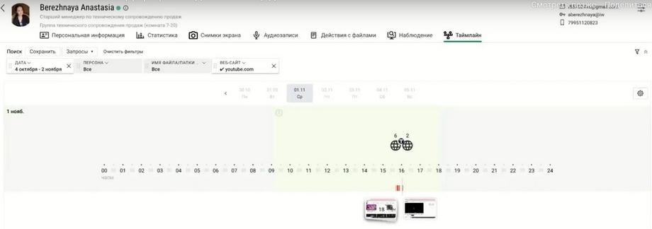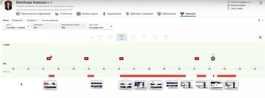 В шапке мы видим, что это за сотрудник. Сейчас мы находимся в разделе "досье". Там тоже есть доступ к таймлайну. И мы видим единый фильтр, который применен по YouTube. Мы хотим оставить только те дни и те события, которые охарактеризованы просмотром YouTube. Т.о. мы видим, что сотрудник смотрел данный web-сайт и на масштабе это можно укрупнить до атомарных событий. Здесь мы видим, что в группе 2 события. Точно то же касается и скриншотов.