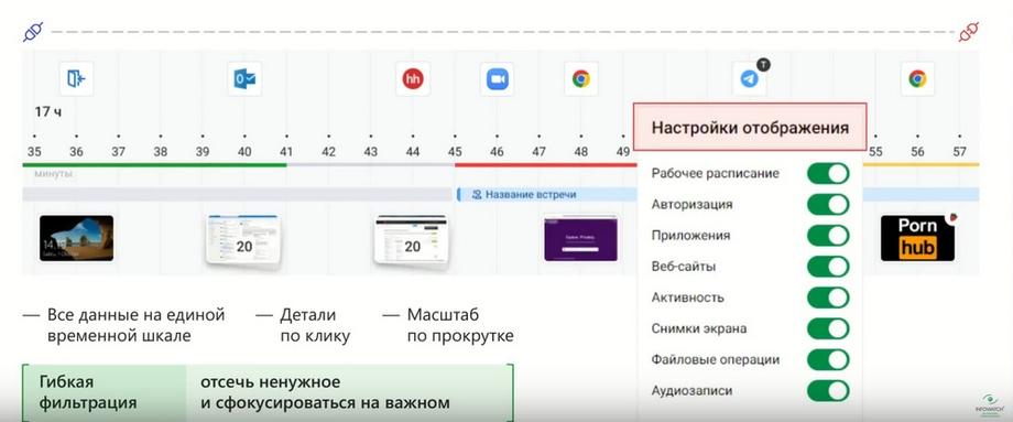Резюмируя, все слои, которые мы сейчас последовательно прошли, имеются два аспекта. Во-первых, можно оставить только самые необходимые. Если вы исследуете последовательность действий с файлом, то вам приложения еще могут быть полезны, поэтому полезны и скриншоты. Но входы-выходы не нужны. Или не нужны аудиозаписи встречи. Вы легко можете слоями убирать или добавлять необходимые, чтобы у вас продолжалась фокусировка, о которой мы заявили в самом начале. Настройки отображений мы считаем важной частью. Но не менее важной частью мы считаем фильтрацию. Оставить только необходимое, если вы, например, отсортируете по рабочей или нерабочей активности. Если вы отсортируете по конкретному приложению, конкретному web-сайту. Т.о. это может быть не только исследованием инцидента, когда вы смотрите временной отрезок и восстанавливаете хронологию, но и поиск узких точек. Например, вы можете просмотреть, сохранив фильтр по какому-то приложению. Как человек с ним работал, в какие дни и оставив только то, что попало под фильтр и только то, что необходимо это и позволит вам сфокусироваться. И, конечно, как работает этот интерактивный инструмент с точки зрения масштабирования и прокрутки. Важный аспект - это профилактика.