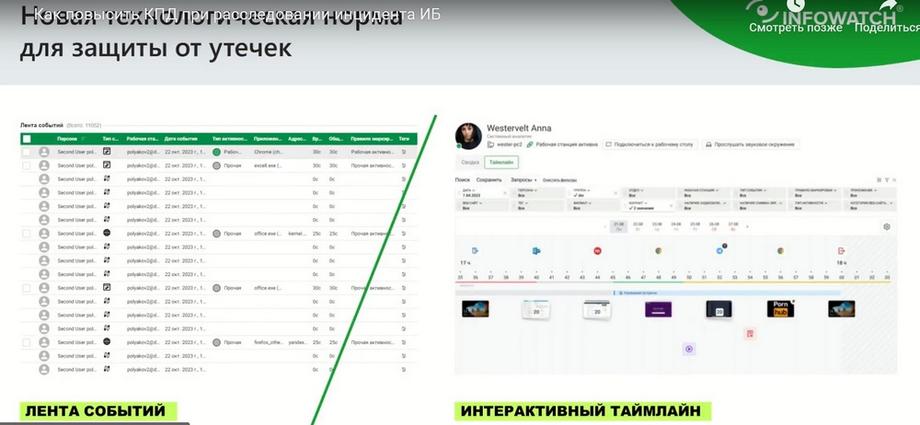 На этом мероприятии был представлен новый инструмент для расследований инцидентов ИБ — интерактивный таймлайн действий сотрудников, аналогов которому нет на рынке, и другие новые возможности для онлайн-наблюдения и ретроспективных расследований, которые появились в системе мониторинга InfoWatch Activity Monitor.