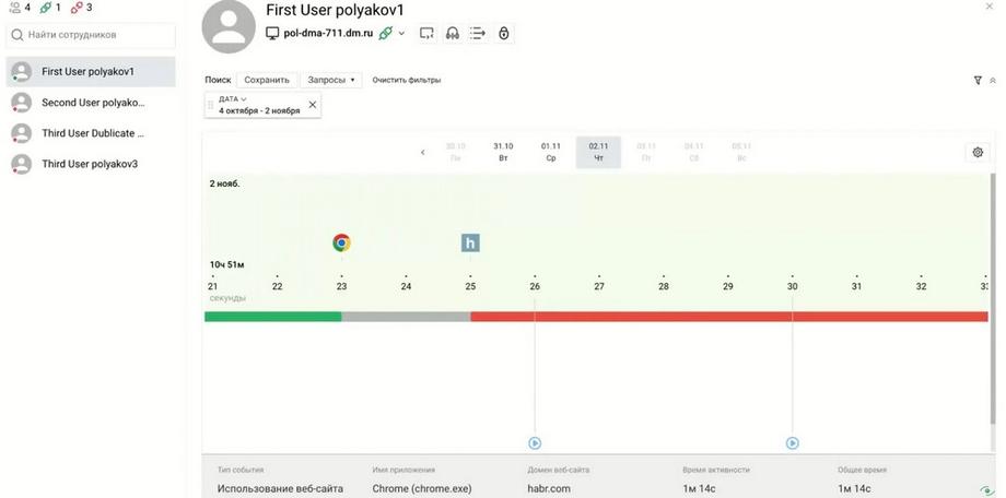Интерактивный таймлайн находится в разделе "Наблюдения". И при клике на любого сотрудника, мы можем открыть и перейти к таймлайну. Вот мы видим, что на текущий день два события авторизации и три события использования web-сайта. Давайте еще добавим приложения. Допустим, что в нашу текущую задачу входит расследование инцидента, восстановление полной картины.