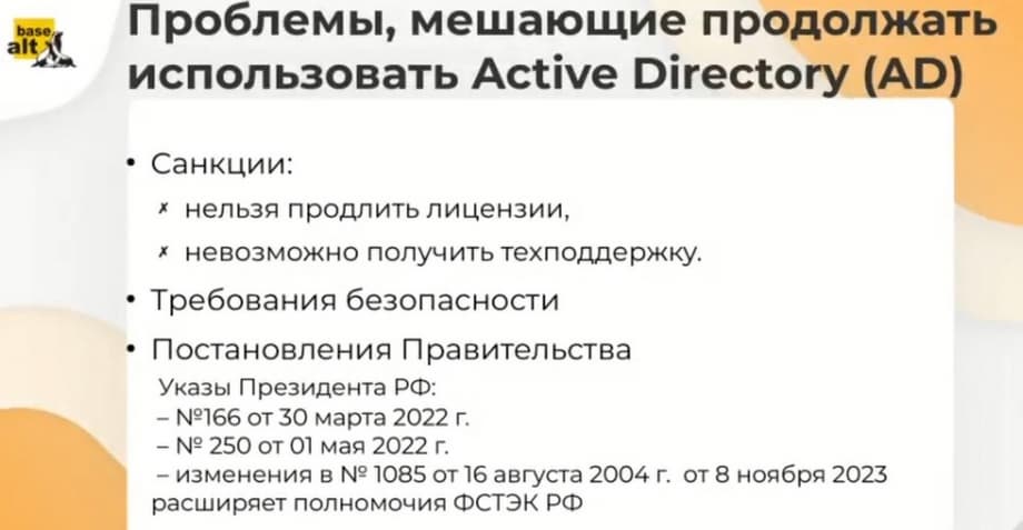 Проект Microsoft Active Directory (AD) более 20 лет завоевывает место на ПК различных организаций и сейчас трудно в России найти развитые инфраструктуры предприятий, которые бы не завели у себя AD домен. В настоящее время платить вендору за этот домен стало невозможно. Использование сторонних закрытых технологий – это еще и весьма существенная угроза безопасности. Дополнительный стимул нам дает правительство, указ президента №166 предписывает согласовывать закупки иностранного ПО. Указ №250 пошел еще дальше, там вообще персональная ответственность вплоть до уголовной.