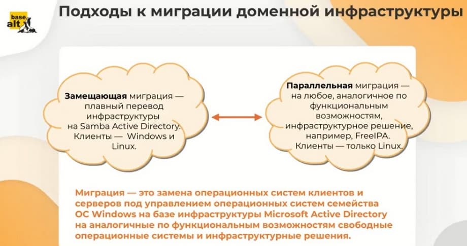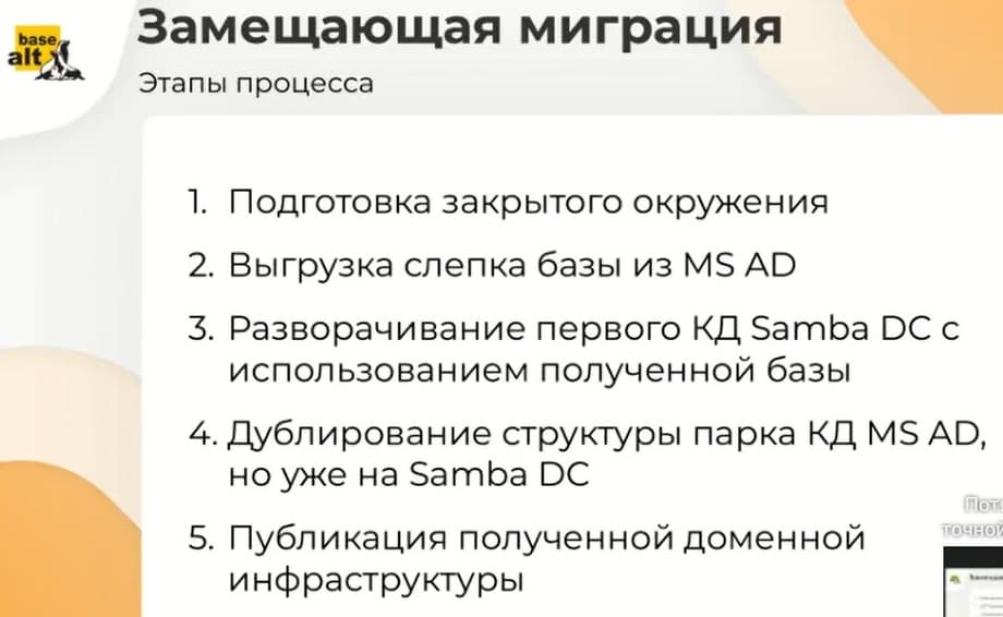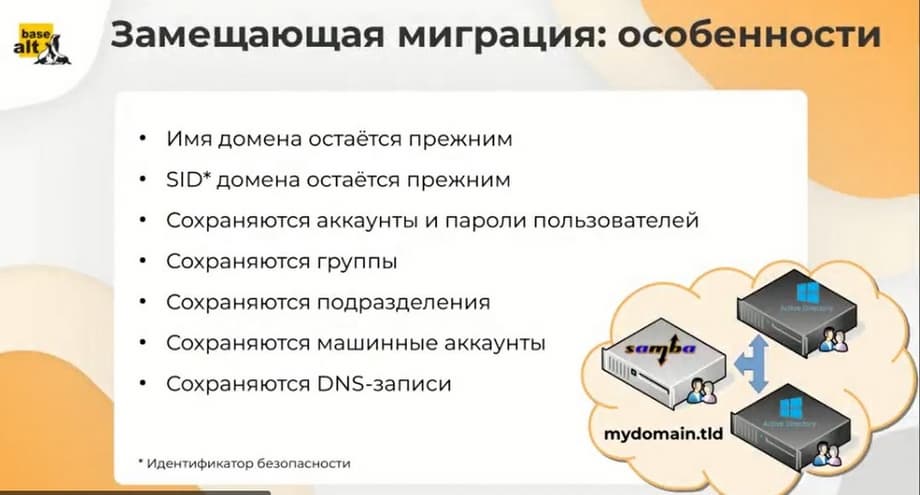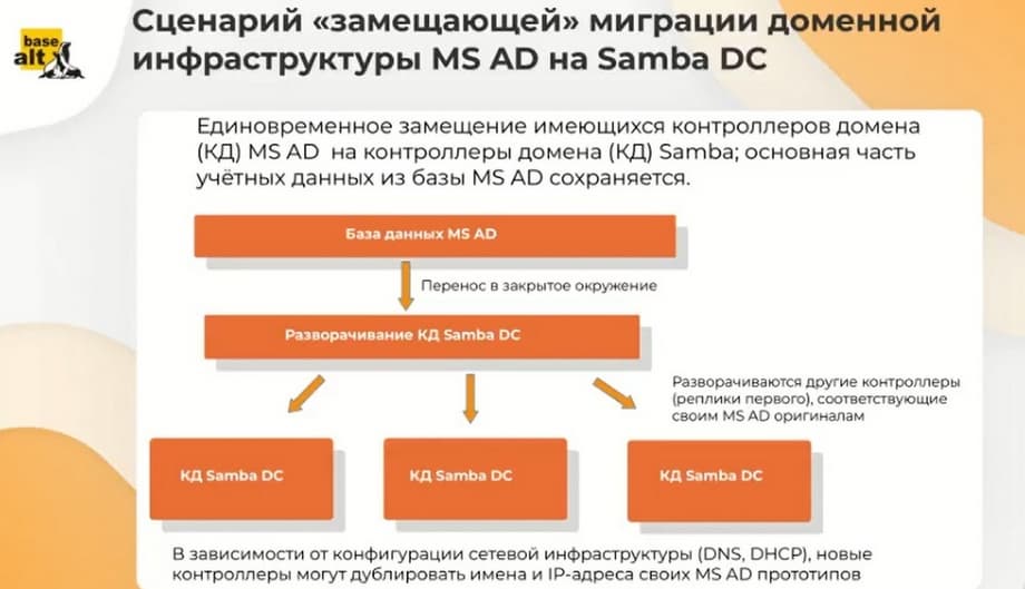 В чем смысл замещающей миграции? Сценарий выглядит следующим образом: у вас есть живой домен AD, у него есть база данных MS AD, которая хранит все данные. Мы разворачиваем внутри контроллер домена Samba DС вторичный и копируем все данные с этой базы в базу нового домена. Потом выдергиваем этот домен и в стороне, в изолированной исходной системе, разворачиваем этот контроллер домена, если есть, то разворачиваем и дополнительные контроллеры домена, и просто копируем всю имеющуюся инфраструктуру.