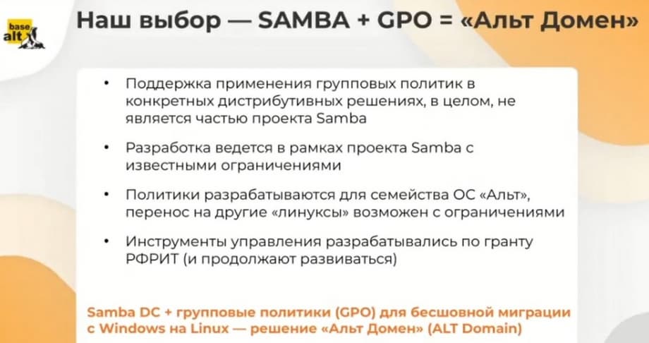 Наша компания придумала как реализовать поддержку групповых политик для Linux машин в рамках проекта Samba. В 2001 году мы нашу идею изложили на конференции Samba, коллеги поддержали эту идею, но мы по-прежнему работаем в открытом поле, т.е. все наши наработки доступны в проекте Samba. Конечно же мы работаем для себя, у нас много особенностей по отношению к другим дистрибутивам. Перенос на другие Linux вполне возможен.