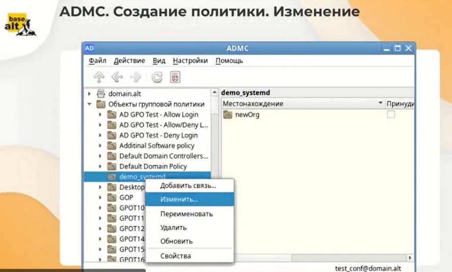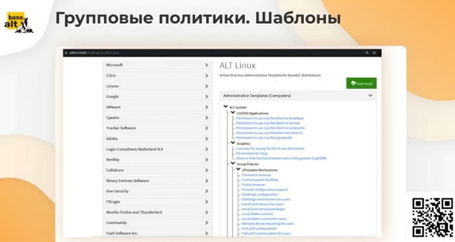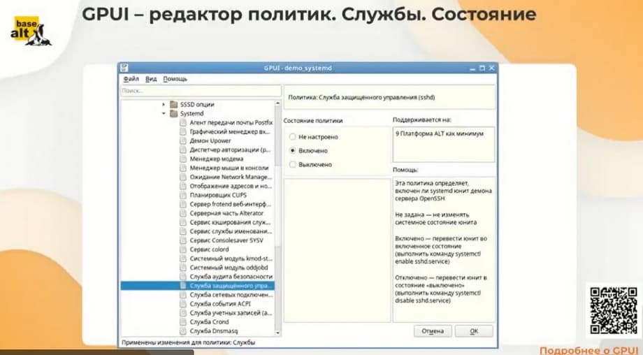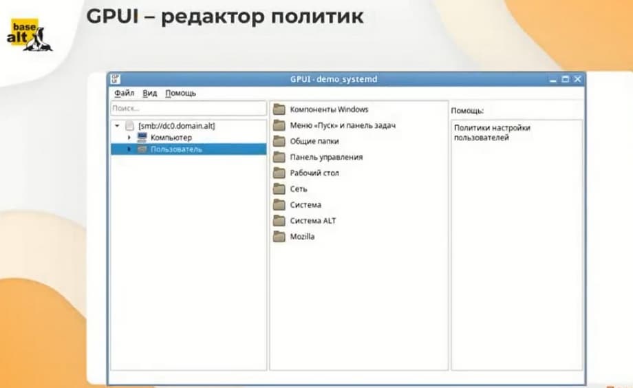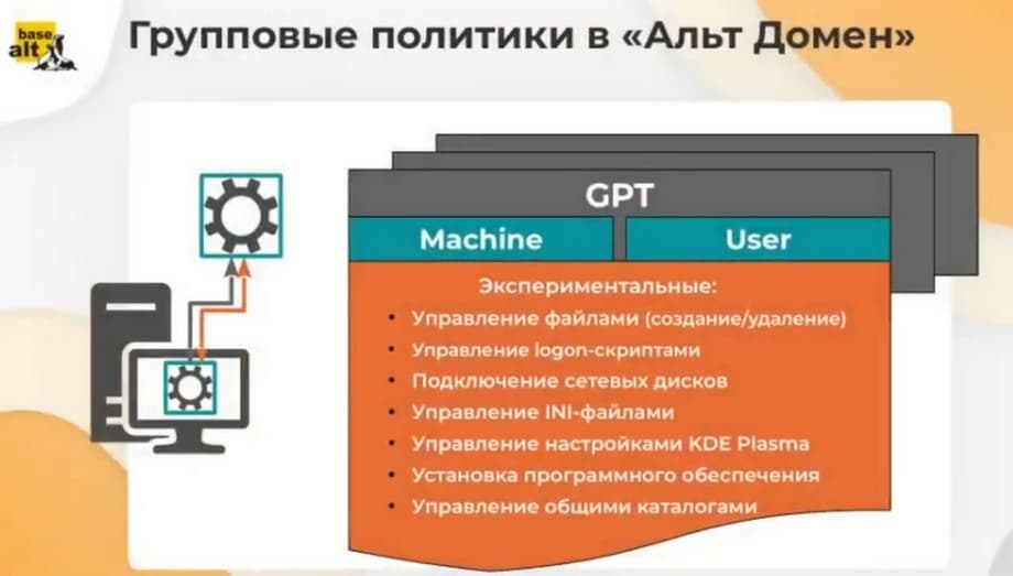 Среди этих политик: управление файлами и logon-скриптами, подключение сетевых дисков, управление INI-файлами, управление настройками KDE Plasma, установка программного обеспечения, это очень сложный процесс, поэтому он пока остается экспериментальным, и управление общими каталогами. У нас сейчас около 1000 политик, у Microsoft их около 3000, есть куда стремиться.