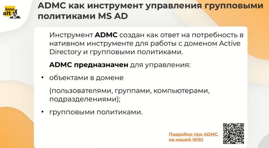 Для этого мы разработали два инструмента, один называется ADMC. Он создан как ответ на потребность в нативном инструменте для работы с AD и групповыми политиками. Его делали так, чтобы у начинающих пользователей не появилось каких-то «непоняток», связанных с интерфейсом.