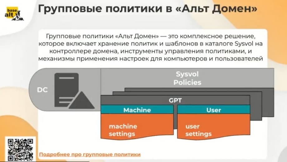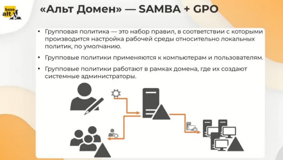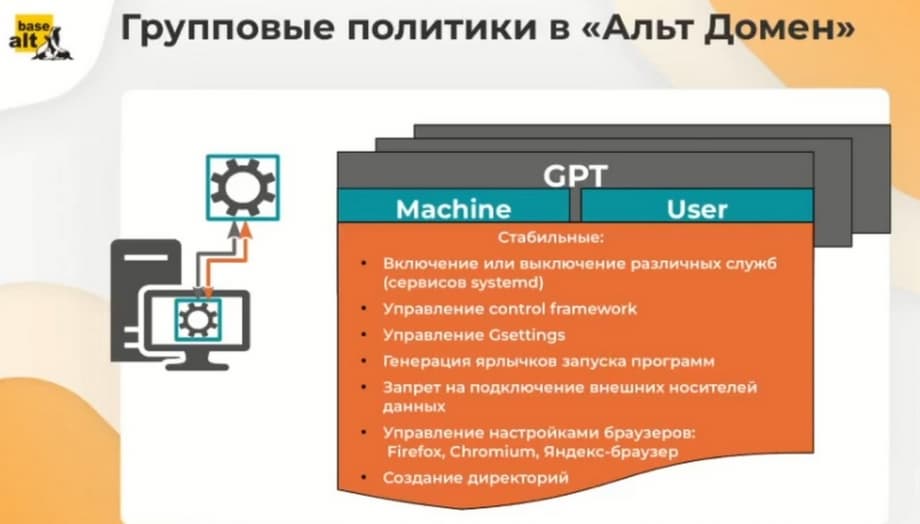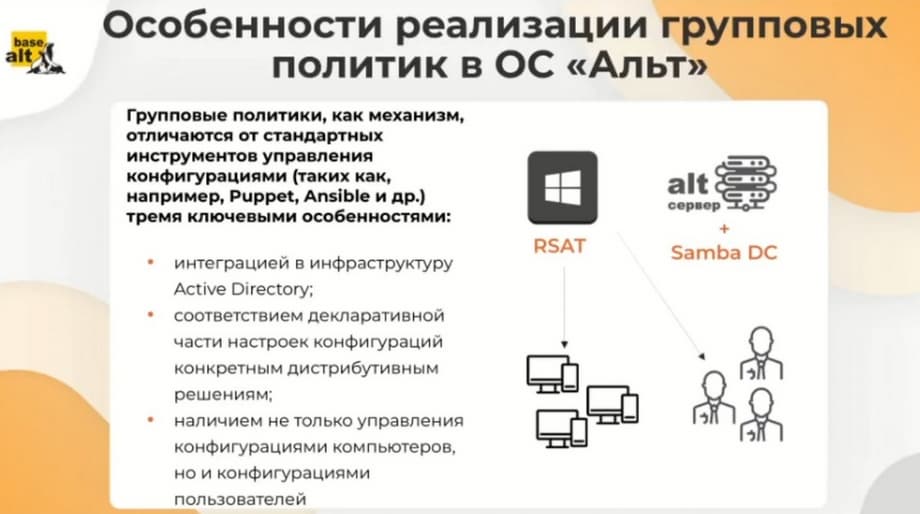 Особенности реализации групповых политик в ОС «Альт». Групповые политики, как механизм, отличаются от стандартных инструментов управления конфигурациями (таких, как например, Pippet, Ansible и др.) тремя ключевыми особенностями: 1) Интеграция в инфраструктуру AD; 2) Соответствием декларативной части настроек конфигураций конкретным дистрибутивным решениям; 3) Наличием не только управления конфигурациями компьютеров, но и конфигурациями пользователей.