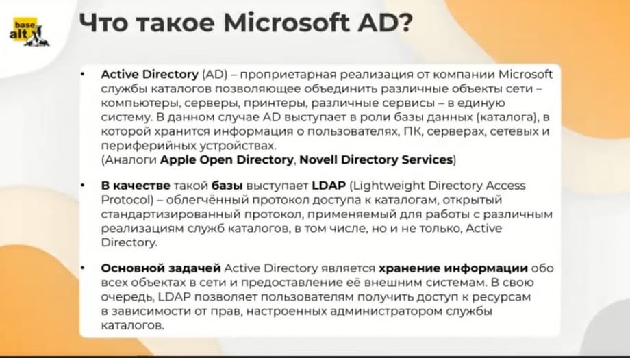 Чем так привлекательная AD? AD – это проприетарная реализация Microsoft службы каталогов, позволяющая объединить различные объекты сети – ПК, серверы, принтеры и различные сервисы в единую систему. В данном случае AD выступаем в роли базы данных каталогов, в которых хранится информация о пользователях и других объектах. В качестве такой базы выступает LDAP, облегченный протокол, доступ к каталогам, открытый стандартизированный протокол, который применяется для работы с различными реализациями служб каталогов. Основной задачей AD является хранение информации обо всех объектах. Для реализации данного решения необходим специальный сервер – контроллер домена – именно он выполняет функции аутентификации пользователей и устройств в сети. Обращение к контроллеру домена может разрешить какие-то действия, если есть права, либо блокировать доступ, если таких прав нет.