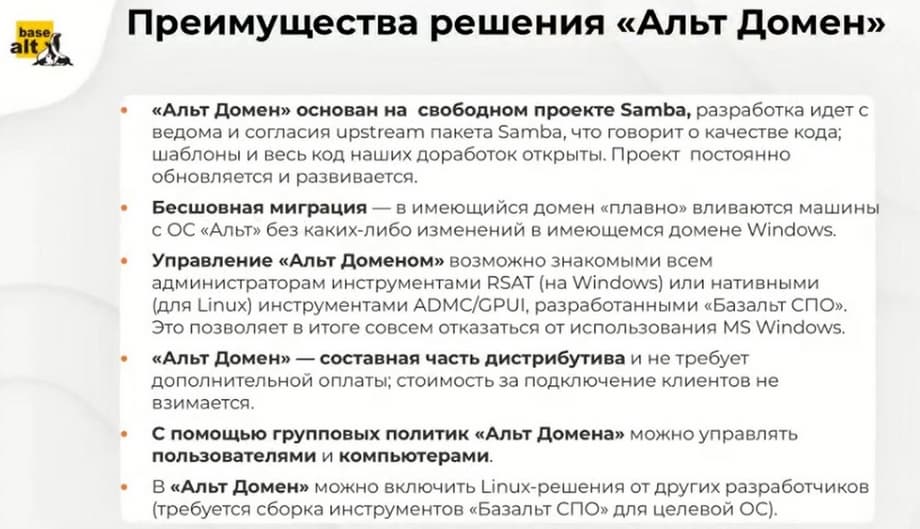 Преимущества решения «Альт Домен» представлены на следующем слайде.