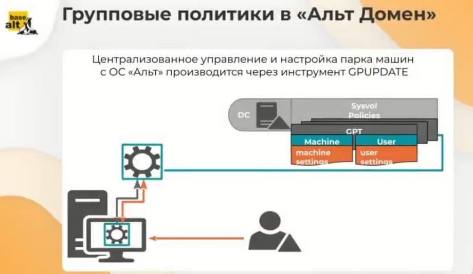 Как и чем применяются эти политики? Централизованное управление и настройка парка машин с OC «Альт» производится через инструмент GPUPDATE, это приложение было написано нашей командой. Это консольный инструмент, без графического интерфейса. Он может обновлять политики раз в час, можно это время установить самостоятельно.