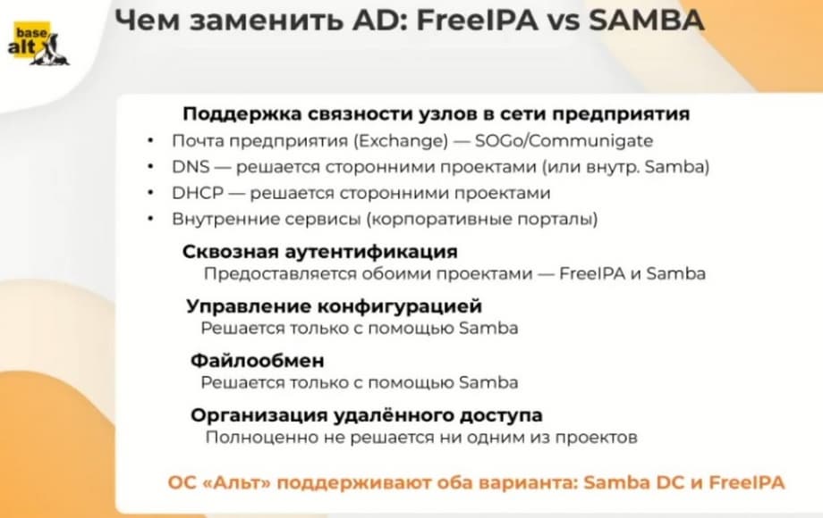Наша компания в 2017 году думала куда идти и развиваться. Поддержка связности узлов сети предприятия, она организуется сторонними приложениями, например, почта (Exchange) за счет SOGo/Communigate. DNS решается сторонними проектами (или внутри Samba). DHCP также решается сторонними проектами. Сквозная аутентификация представляется обоими проектами FreeIPA и Samba. Управление конфигурацией и файлообмен решается только с помощью Samba. Организация удаленного доступа полноценно не решается ни одним из проектов. ОС «Альт» поддерживают оба варианта Samba DC и FreeIPA.