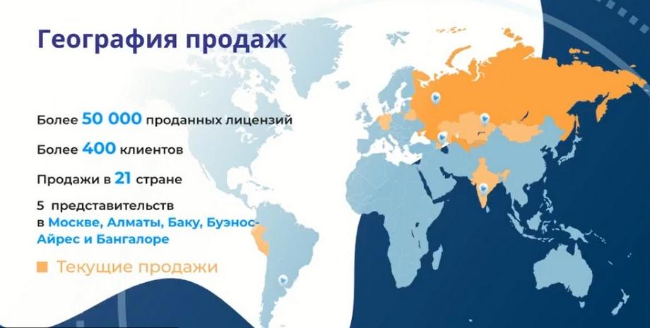 География продаж весьма обширная, имеется несколько представительств по всему миру. Но основной фокус направлен на российский рынок и на страны СНГ. За год своей деятельности мы успешно продали более 50 тысяч лицензий и реализовали более 400 проектов в различных сферах.