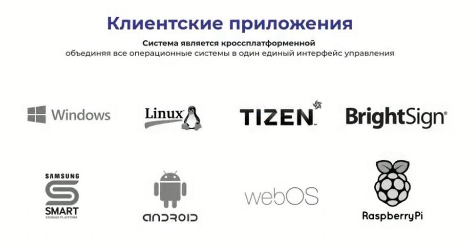 Как работает наша платформа? Пользователь при помощи планшета, мобильного устройства или компьютера может зайти на наш ресурс, привязать устройство и загрузить туда подготовленный заранее контент. Дальше назначается расписание, и этот контент по расписанию будет выходить в эфир. Мы работаем со следующими ОС: Windows, Linux, профессиональные панели Samsung на базе TIZEN, BrightSign, Android, WBS (операционная система LG) и RaspberryPi.