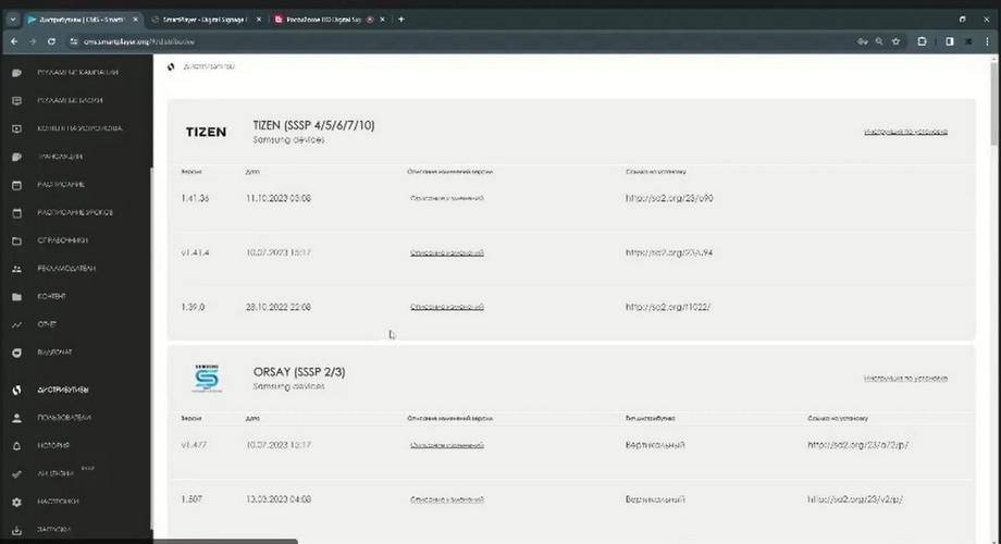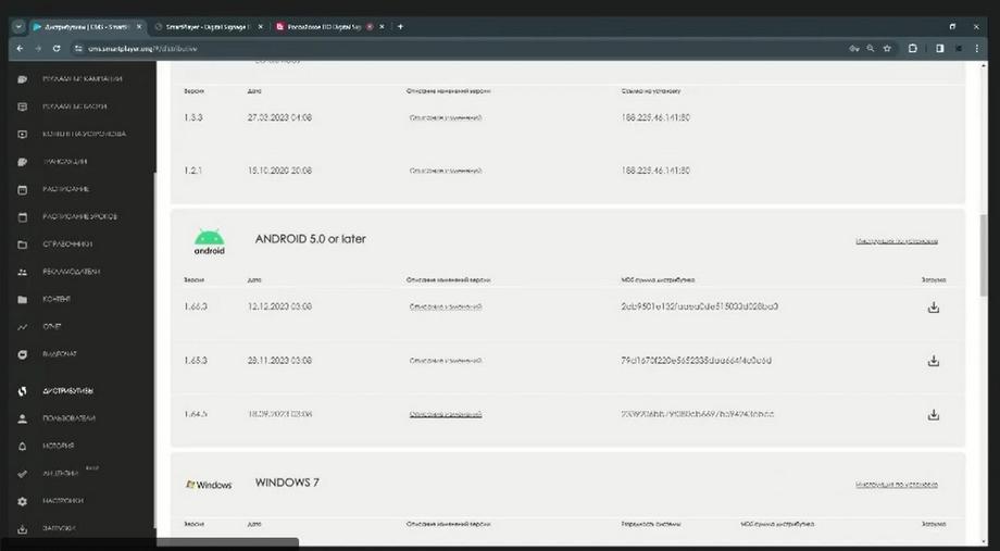 Первоначально работа начинается с установки клиентских приложений. Скачать их можно из раздела «Дистрибутивы». Для облачного решения они доступны по умолчанию, если же используется локальный сервер, то они собираются с учетом конфигурации сервера. Повторюсь: мы работаем с Samsung на базе TIZEN, LG - это непосредственно WBS. Устройства под управлением Android. Это могут быть как профессиональные дисплеи на базе Android, так и Android-приставки.