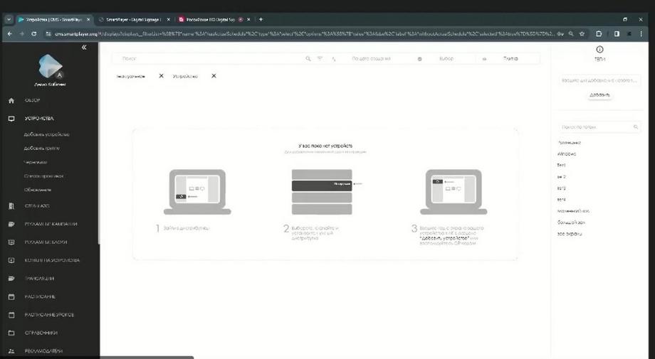 И далее в разделе "Устройство" его добавляем, и можем с ним взаимодействовать. В настоящий момент у меня подключено одно устройство. Это мой компьютер. Значит, я могу с ним взаимодействовать, могу обновить Screenshot, узнать, что в настоящий момент транслируется на экране, посмотреть укрупненный Screenshot, историю. Т.е. у нас уже есть мониторинг состояния.