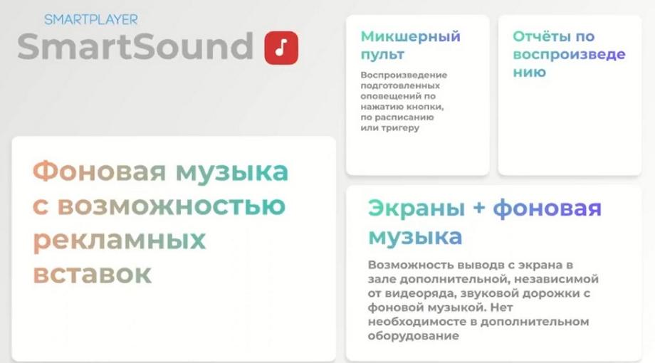 Лицензия SmartSound - самая простая лицензия. Она позволяет проигрывать фоновый звук, но в ней имеются свои фишки. Первая - это возможность проигрывать рекламные вставки. С помощью нашего внутреннего пульта можно назначить рекламные вставки. Это можно сделать вручную, с тем, чтобы они выходили в определенный момент времени. Можно назначить определенную периодичность их выхода, например, один раз в 3, 4 или 5 минут. Можно поиграть со звуком. Например, основная фоновая музыка звучит с громкостью 20, а рекламная вставка - с громкостью 40. Для того, чтобы рекламная вставка привлекала большее внимание.