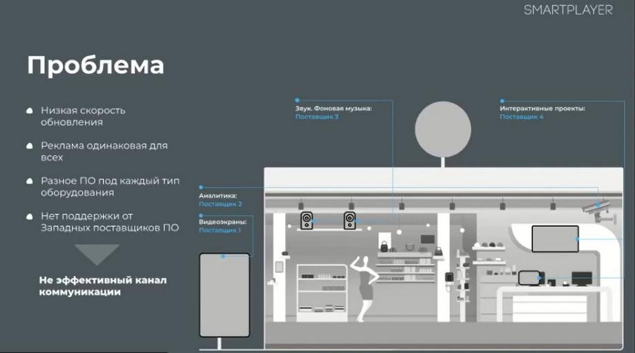 Основная проблема, с которой к нам приходят заказчики, состоит в необходимости оперативной смены контента. А еще часто у заказчика на объекте присутствует "зоопарк" оборудования, где приходится использовать несколько поставщиков. Наша же платформа позволяет все это объединить в единый функционал и пользоваться только нашим решением. К нашей системе можно подключить и фоновый звук, и тач-панели, и профпанели.