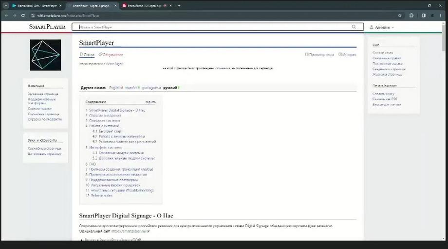 «НАСТРОЙКИ». Здесь все настройки относятся непосредственно к самому интерфейсу, отдельно выделить несколько. Это ГРАФИЧЕСКИЙ КОНТЕНТ ПО УМОЛЧАНИЮ, многие заказчики начиная работать с нашей системой могут допустить какую-то ошибку, т.е. сделать так, что на экране не будет отображаться никакого контента, чтоб уменьшить негатив, можно выставить заставку. В настройках есть ДОКУМЕНТАЦИЯ, которая ведет на нашу Википедию, здесь задокументирована работа со всеми платформами.