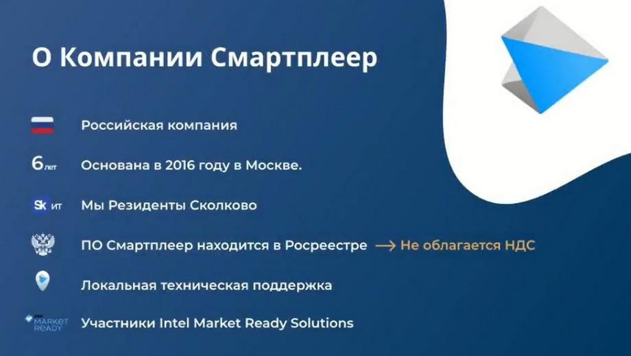 Мероприятие, посвящённое SmartPlayer – платформе для реализации мультимедийных проектов любой сложности и централизованного управления устройствами. К преимуществам решения относятся: возможность доработки ПО и разработки нового функционала под требования заказчика, кроссплатформенность и локальная техническая поддержка