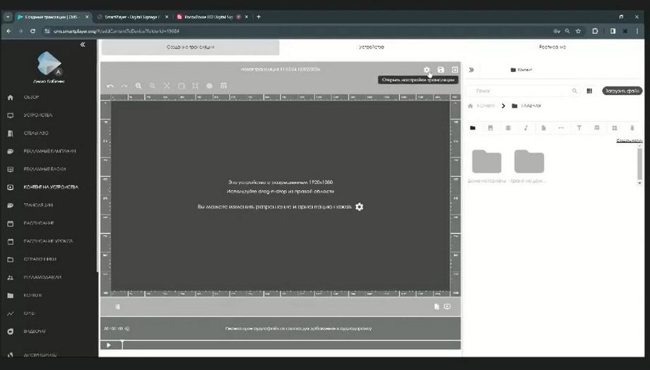 После того, как добавлен контент, переходим к созданию самой трансляции. Самым простым вариантом является функционал-контентное устройство. В нем по умолчанию создается Full HD горизонтальной ориентации. Если же заказчик использует вертикальную ориентацию, то буквально нажатием двух кнопок мы меняем ориентацию дисплея. Если же у вашего заказчика custom разрешение, т.е. LED-экран, то это тоже можно здесь указать. Далее просто добавляем нужные нам материалы.