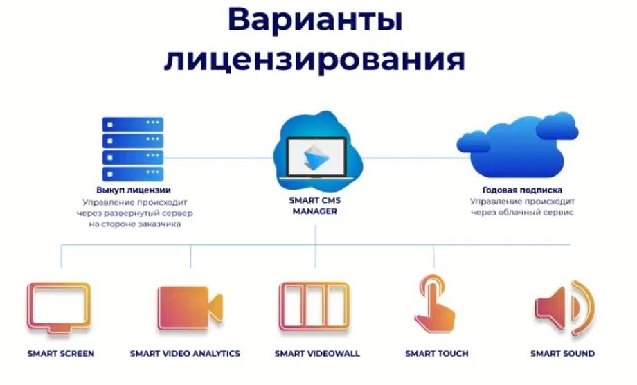 Варианты лицензирования у нас разные. Самые популярные лицензии у нас SmartScreen. Эта лицензия подойдет для standalone экранов и для проигрывания статического и динамического контента. Здесь используется разрешение Full HD, HD и 4K. Также эта лицензия позволяет проигрывать всевозможные виджеты, т.е. миниприложения, специально созданные в нашей системе. Это может быть курс валют, погодный виджет, пробки, навигация, все, что угодно.