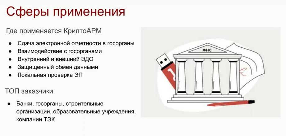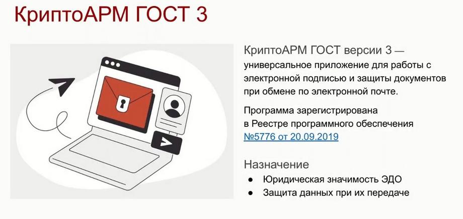 КриптоАРМ – это программа, которая позволяет на любом рабочем месте подписать любой документ, подписать, зашифровать и его передать конечному получателю. Это направление сдачи электронной отчетности для взаимодействия с государственными органами. В первую очередь это Банк России и Росалкоголь-регулирование, также Рособрнадзор.