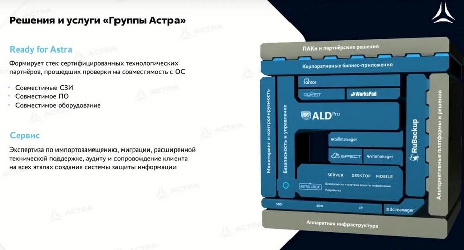 У нас также есть сервисная часть. У нас используется продуктово-сервисная стратегия, мы оказываем такие сервисы, как Ready for Astra – это сервис, который проводит тестирование на совместимость средств защиты, программного обеспечения, оборудования. В этом направлении мы давно и активно работаем. Мы осуществляем техподдержку партнеров, помощь при внедрении, мы также оказываем помощь в разработке архитектуры, систем защиты и интеграции.